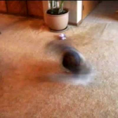 Dog spins in circles really fast and spins all the way out the door into the backyard.