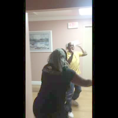 A woman dances in front of a security camera, then walks straight into the glass front door and two other women laugh at her. Security footage.