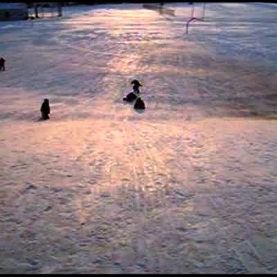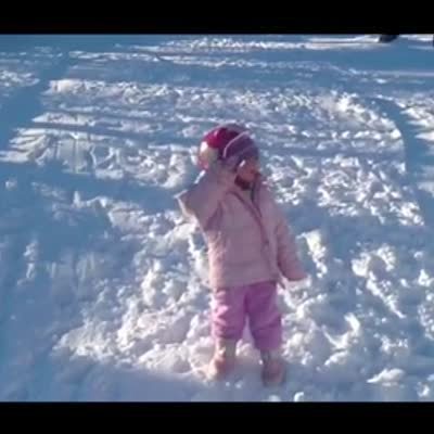 Big woman goes downhill on a sled & runs into young girl at the bottom, making her face plant. Shot from far away. Winter.