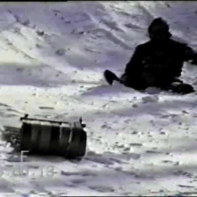 2 kids on an inner tube sled and crash into the back of a woman walking downhill. Winter, snow.