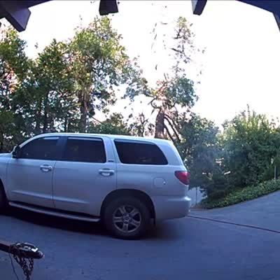 A 4 wheeler rolls down a hill outside by itself. A man screams and chases after the ATF but it crashes into a tree. Security Footage.