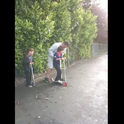 Dad pushes son on scooter through puddle on black top, boy hits drain and falls face-first into water.