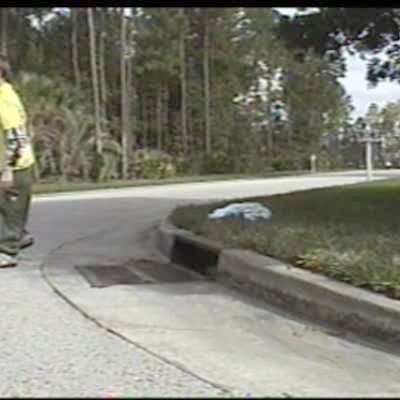 Boy tries to slide on a sewer drain on his skateboard, his board falls into the drain. He's able to get it out. Bonehead.
