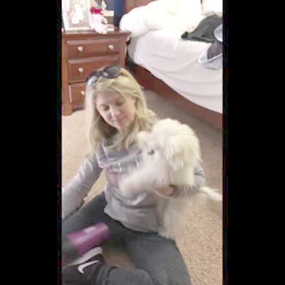 A woman blow drys her dog with a hairdryer and the dog swings at it.