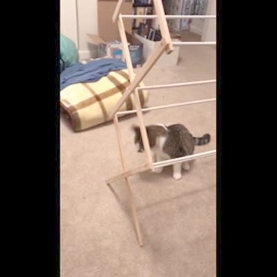 A cat climbs a wooden rack used to dry clothes and falls down onto pillows.