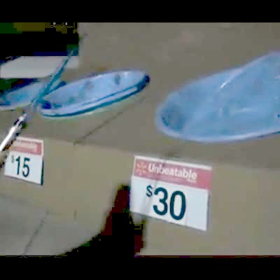 A woman jumps into a dry pool on display at a store when it falls through the hole in the back of the display indoors.