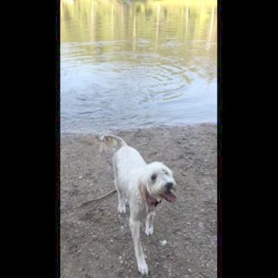 A dog climbs out of a pond and shakes itself dry in slow motion.