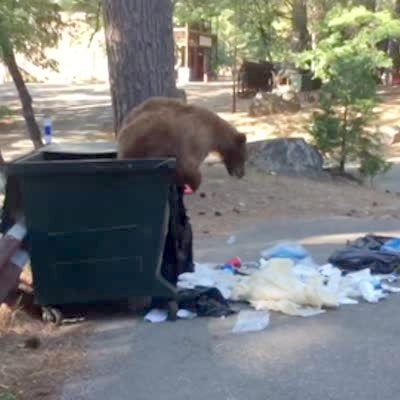 A man outside of a school unlocks a trash dumpster and a black bear crawls out. He runs away and then the bear runs in the opposite direction. Security Footage. Featured talent cleared only (the man at the dumpster)