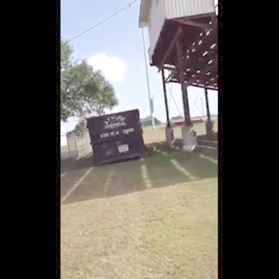 A man uses a truck to pull a building off a stand of bleachers. The building falls on to a dumpster and breaks apart.