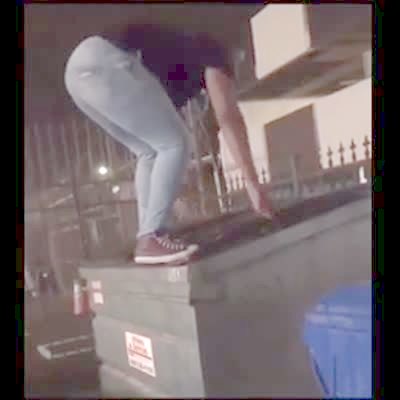 A teen boy sits on top of a dumpster. Then the lid of the dumpster falls back and the teen fall back too.