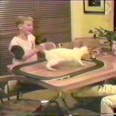 Cat chases toy electric car in circles around track, cat gets dizzy and falls off table onto the floor. Spin. Used in CompuServe 9-95 (CS).