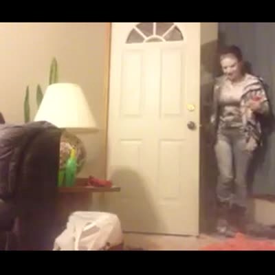 A girl and boy throw buckets of water and flour on their mom when she comes homes and opens the front door of a house. We don't see her get hit, but after a minute she walks in covered in flour and yells "what the F***."