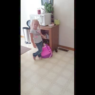 A man places a fake rat in the side of the kitchen and has it roll out into the middle of the room to scare a young girl when she enters the room. The girl gets scared when she sees it and she throws her backpack on it.