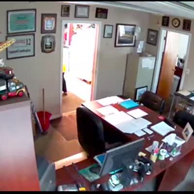 Security camera footage of a woman who trips as she walks into an office and falls on the floor.