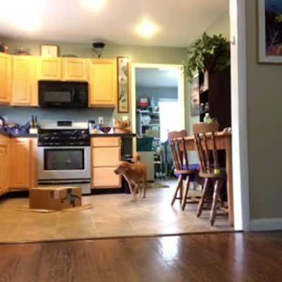 A woman and a Boston Terrier enter a house and when the woman says, "Ready, set, sploot!" the dog lies on the floor with her legs spread.