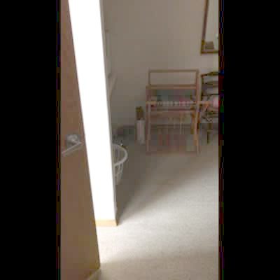 A black bear walks into a house and looks around. A woman tells the bear to leave and the bear backs out. The bear paws at a rug, but the woman tells it no, so the bear takes a bottle of ammonia out of the house.