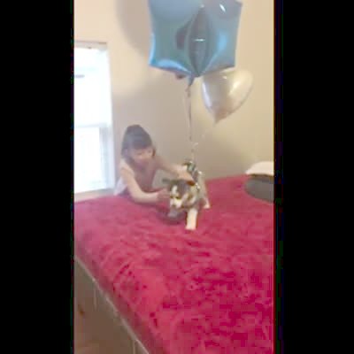 A girl gets excited when she enters a bedroom and sees that she got a puppy dog as a birthday present. She starts to pet it and it poops on the bed.