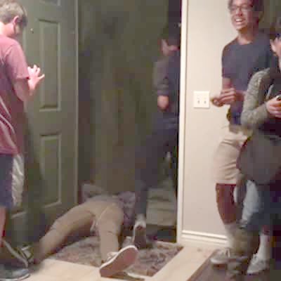 A teen boy enters a house and a group of people in the living room yell "surprise" and scare him and he falls down.