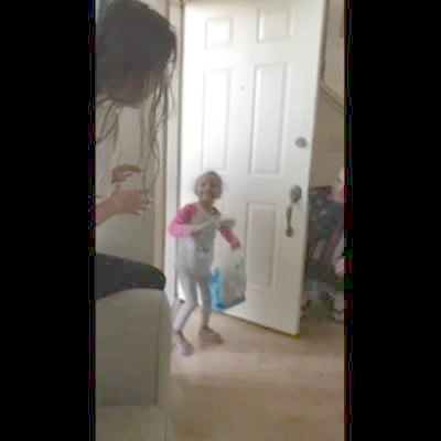 A young girl enters her house and a woman pops out to scare her. She laughs at her because she wasn't scared but meanwhile another man creeps up on her and scares her good. The young girl screams and throws her bag on the ground.