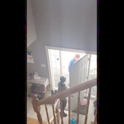 A young boy enters the house, everyone yells "surprise!" and balloons fall from the ceiling. Unimpressed, he says nothing then turns right around and leaves.