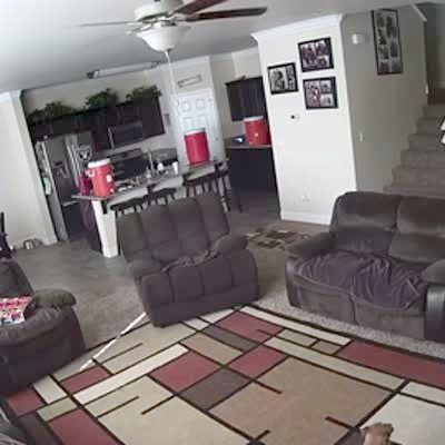 When a cat enters a house carrying a bird a man and young girl scream. The man catches the cat and puts it outside, but the bird flies away inside the house. The man picks up the bird in his hands and then frees it outside. Security footage.