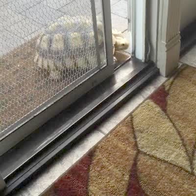 A tortoise in a backyard pries open a screen door and walks into the house. A woman with the camera commentates.