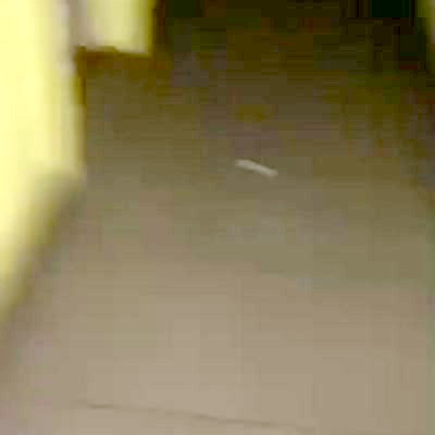 A cat hanging from the ceiling of a house has knocked free several ceiling panels before climbing into an opening in the crawl space.