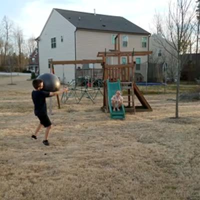 A young girl falls off a slide in the backyard when a teen boy kicks an exercise ball and it hits her in the face.