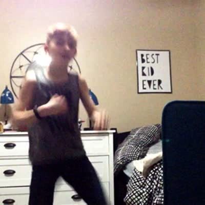 A boy dances in his room. His brother throws a big bouncy ball that hits the dancer in the face, and the dancer falls onto his bed. USE THIS CLIP (same as #764864 and #765124)