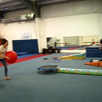 Girl jumps onto an exercise ball bounces off. The 2nd try, the ball moves and she hits / falls onto the floor. Short tails. SHORT CLIP.