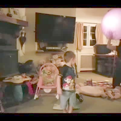 A young boy hits another young boy in the face with an exercise ball while he dances to a song in a bedroom. USE CLIP #760108 (same as #764864 and #765124)