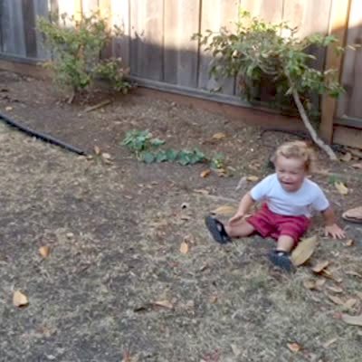 A man holds an exercise ball up to bounce it in a yard and a baby boy gets scared and walks away. The man says "I'm not going to hit you". The man bounces the ball and realizes it is going to hit the baby boy and says "Oh" and the ball hits the baby on the head and he falls down.