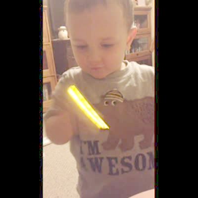 A baby boy waves around a fake electric candle and repeatedly tries to blow it out.