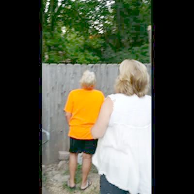 A mom opens a cabinet in her kitchen and a fake mouse falls out. She screams and says she peed her pants as her sons cheer.