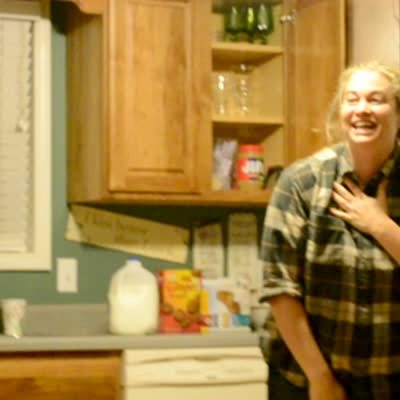 Woman tells man she thinks she saw a mouse under the kitchen cabinet, when he looks a big fake bug jumps out at him and he curses. Scares, practical jokes. Includes set up footage.