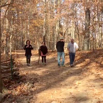 A man tries to scare his family while they walk in the woods. He trips as he jumps out from behind a tree and fall to the ground.