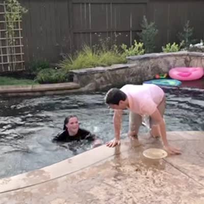 A family plays in a backyard and a dad tries to push his teen girl into a swimming pool. She pulls him as she falls into the water and he falls in. He gets out and pushes her back in.