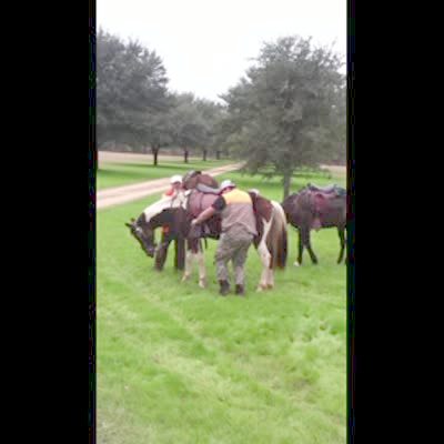 A man struggles to climb onto a horse outdoors and falls off of the far side.