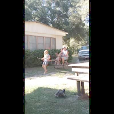 A young girl pulls a man and a woman in a cart in a yard. The cart tips too far back and the man and woman fall backwards and the girl goes into the air.
