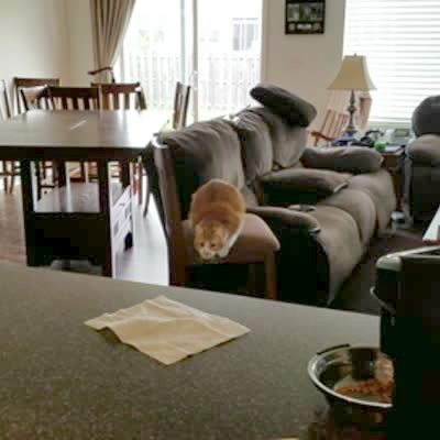 A cat tries to jump from a chair to a counter, but doesn't jump far enough and falls.