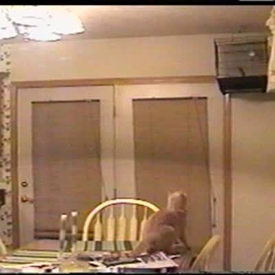 "Helium Housecat" Cat jumps onto a table trying to reach a balloon. He reaches out too far and falls off the table. SAME CAT AS #643979/W119395 ON 4W-03 @ 3:22:48.
