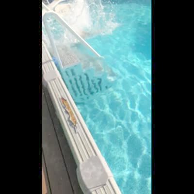A teen girl records herself to show how to do a Color Guard trick, but she steps back too far and falls out of frame into the swimming pool.