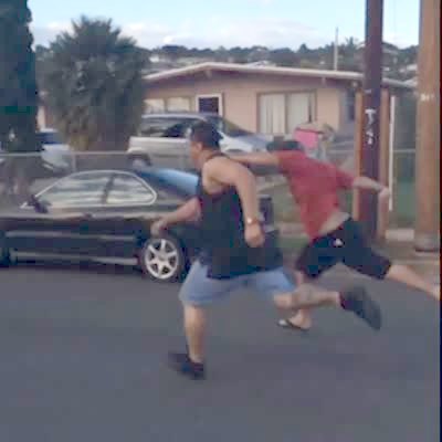 Two adult men race each other while running down a street outdoors. Both stumble and fall on the asphalt at the same time. One gets up and finishes the race while the other quits.