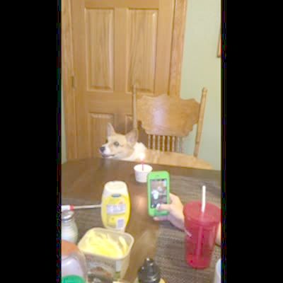 A family sings happy birthday to their dog and before they finish he takes the treat and candle off the table with his mouth. Short tail.