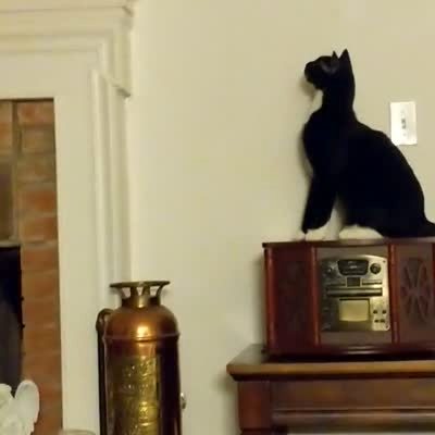 Two cats walks along the mantle above the fireplace in the living room. They go behind a tapestry that hangs from the wall and wrestle and one of them falls off the mantle.
