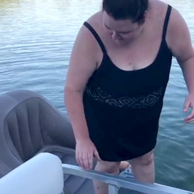 A young boy in water wings climbs on the edge of a boat in a lake and his older brother pushes him off into the water after their mom tells him not to do that. Music rights not cleared.