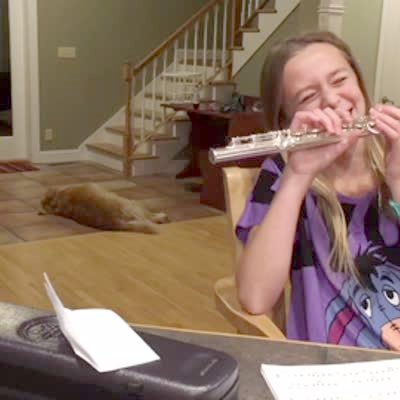 A teen girl plays flute and a Golden Retriever dog laying on the ground howls, but doesn't move.