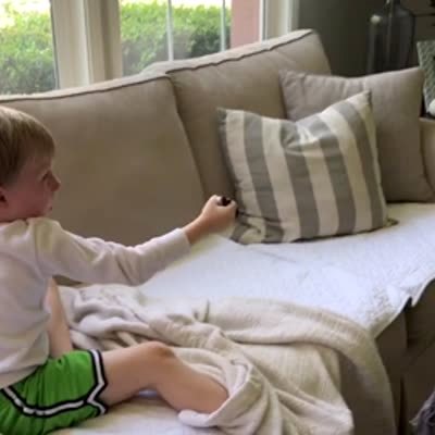 A family finds a bird in their living room and a young girl tries to touch it but it jumps on the couch. A tot boy grabs the bird and lets it go out of an open door and his family screams and looks surprised.