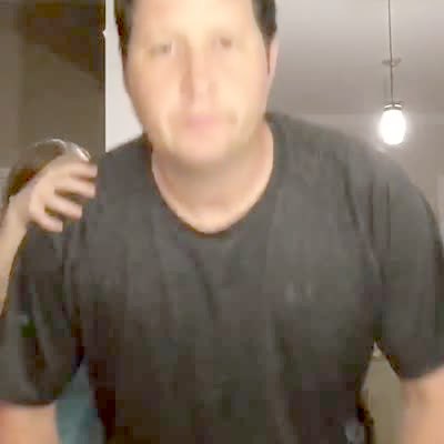 A man calls his young son into the living room, and the boy runs into a sheet of plastic wrap across the doorway.