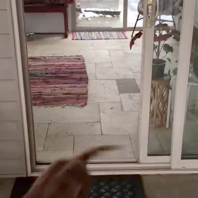 A dog jumps up and down in front of an open door because he doesn't realize he can't walk in.